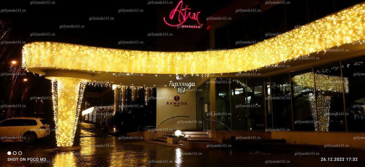 - Фасадную часть здания украшает бахрома и длинный светодиодный занавес тепло-белого цвета, которым декорированы колонны. Классическое тёпло-белое свечение хорошо сочетается с фасадом гостиницы.