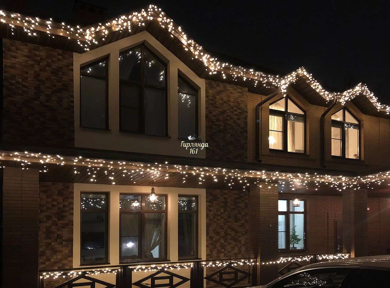 - Контур крыши дома подсветили гирляндами. Классическое тёпло-белое свечение хорошо сочетается с фасадом бежевого цвета.