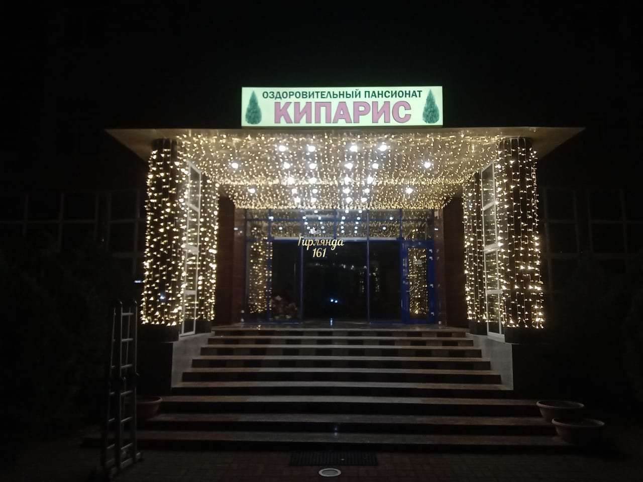 - Задача: подсветить фасадную часть отеля светодиодным занавесом, теплого белого цвета свечения, беседки декорированы ретро-гирляндами тёплого белого цвета