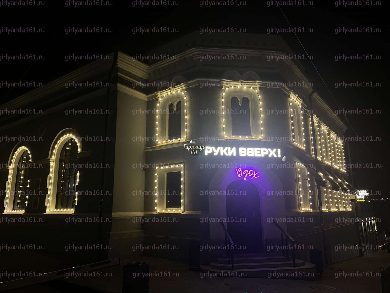 - При праздничном оформлении бара "Руки ВВерх" специалистами нашей компании использованы профессиональные гирлянды. Благодаря использованию праздничной иллюминации, облик фасада превратился в волшебную панораму. Пройти мимо такой красоты просто невозможно.