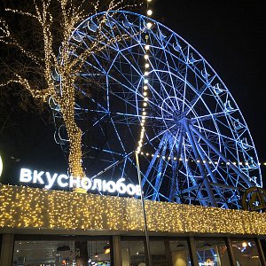 - Контур крыши оформлен светодиодной бахромой тепло-белого цвета. Дерево плотно обмотано светодиодной гирляндой на деревья. Иллюминация прекрасно смотрится и освещает фасад, привлекая внимание прохожих в парке.