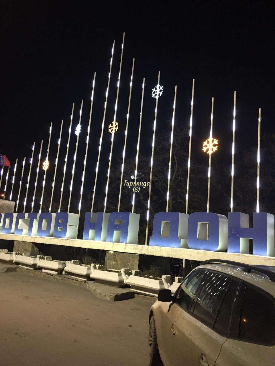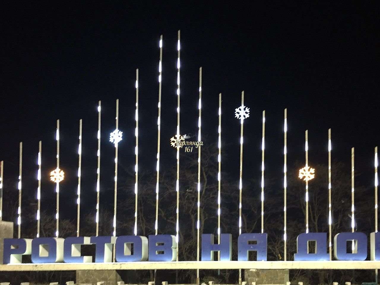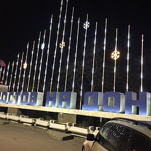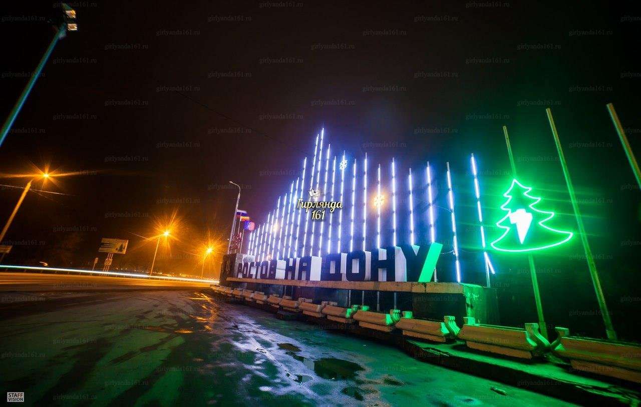 В рамках проекта был декорирован и освещен круглый профиль, расположенный на заднем фоне стелы «Ростов-на-Дону» гибким неоном холодного белого цвета. Дополняют данную композицию светодиодные снежинки холодного белого цвета и елочка из зеленого неона.