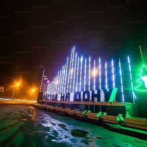 - Задача: освещение стелы въездной группы гибким неоном, декорирование светодиодными снежинками.