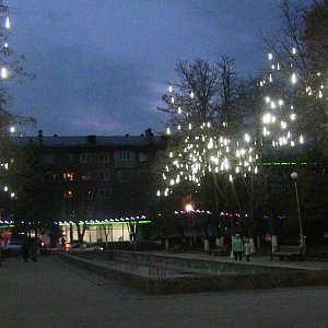 - Деревья украсили светодиодными сосульками 10*0.5 м, теплый белый цвет.