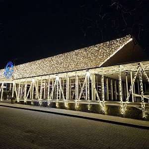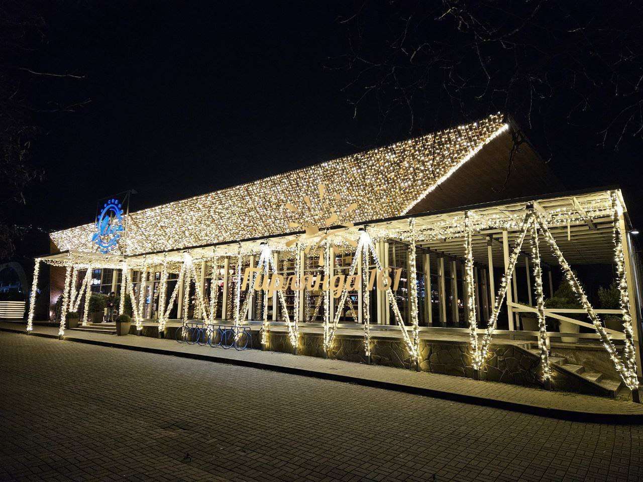 Фасадную часть здания украшает гирлянда теплого-белого цвета.