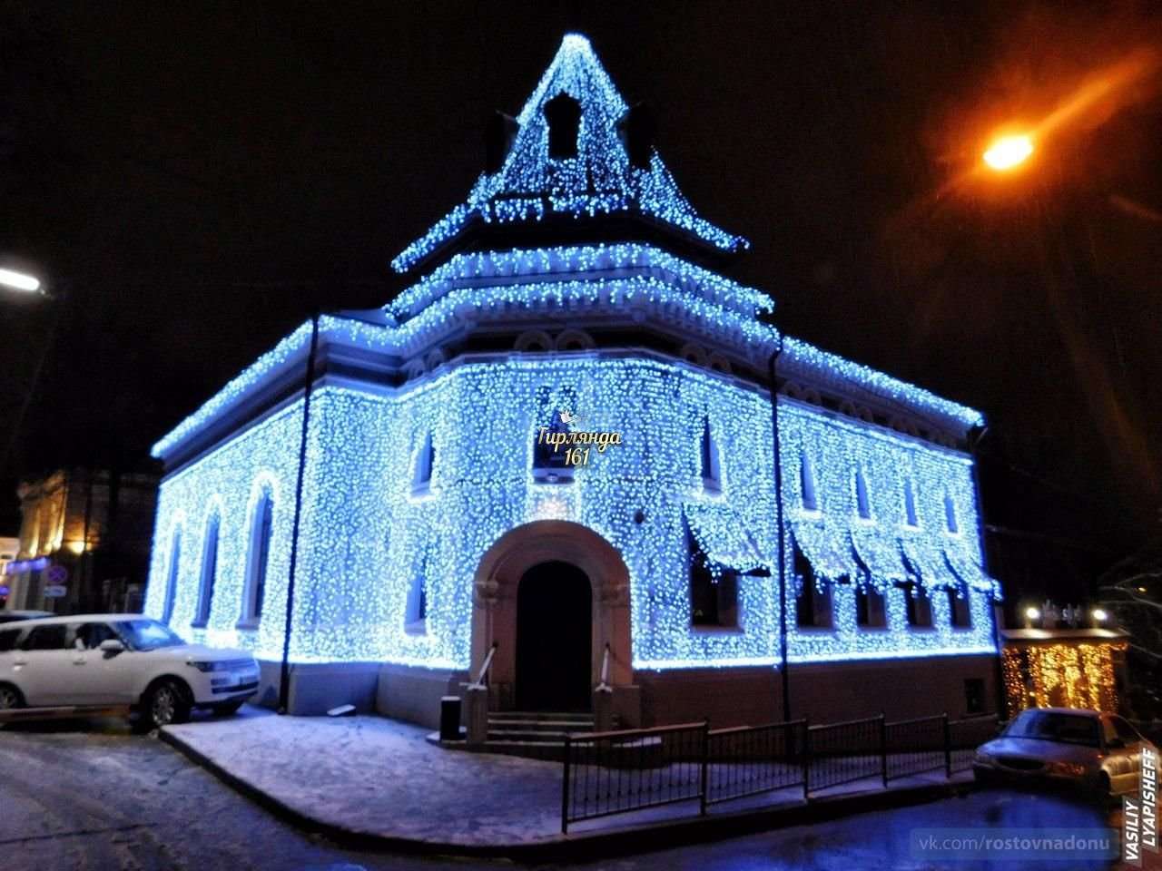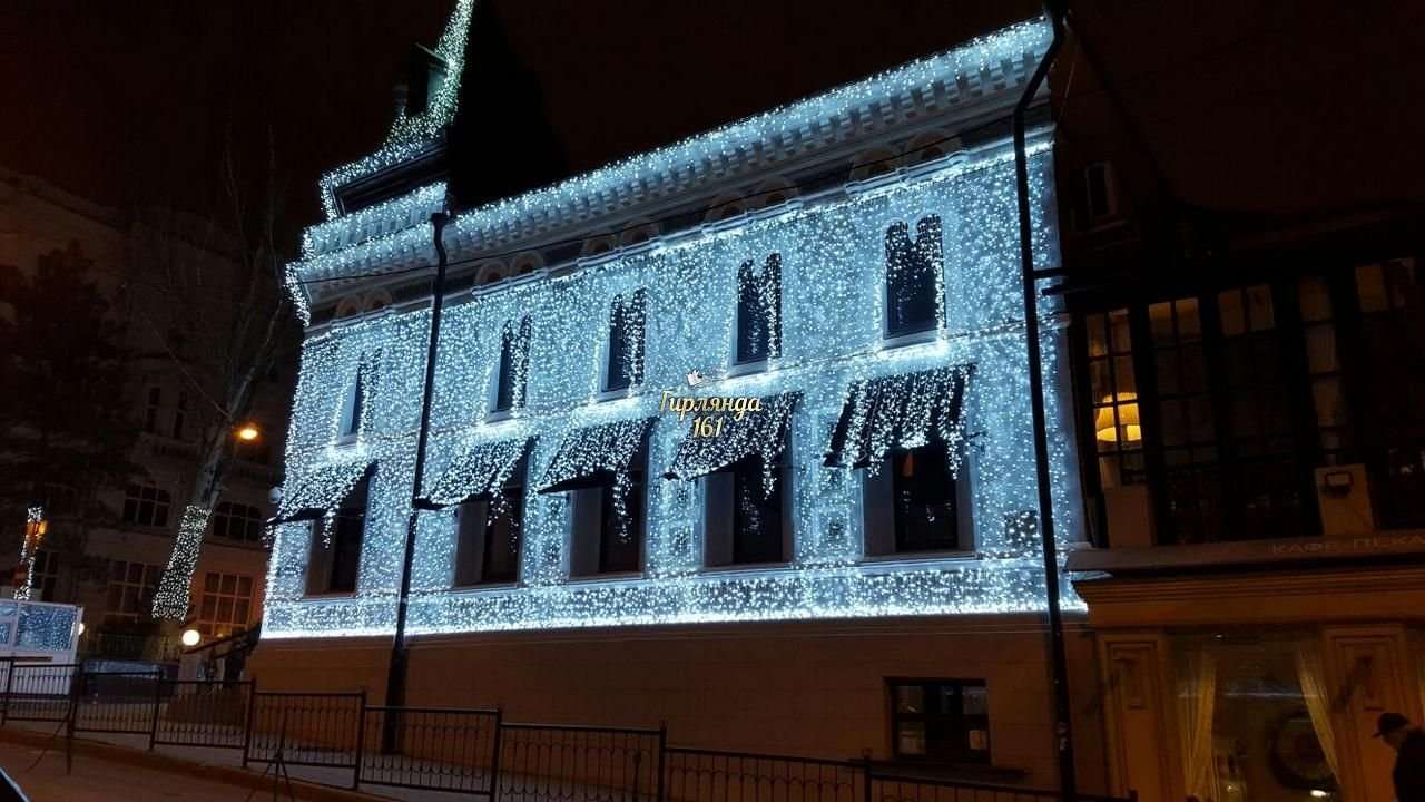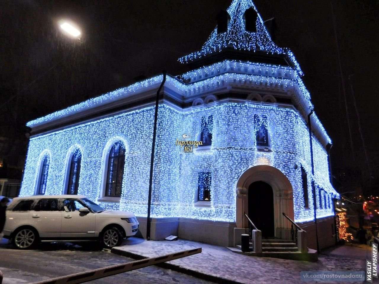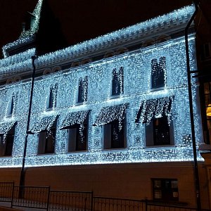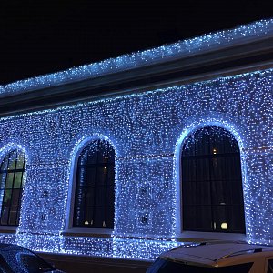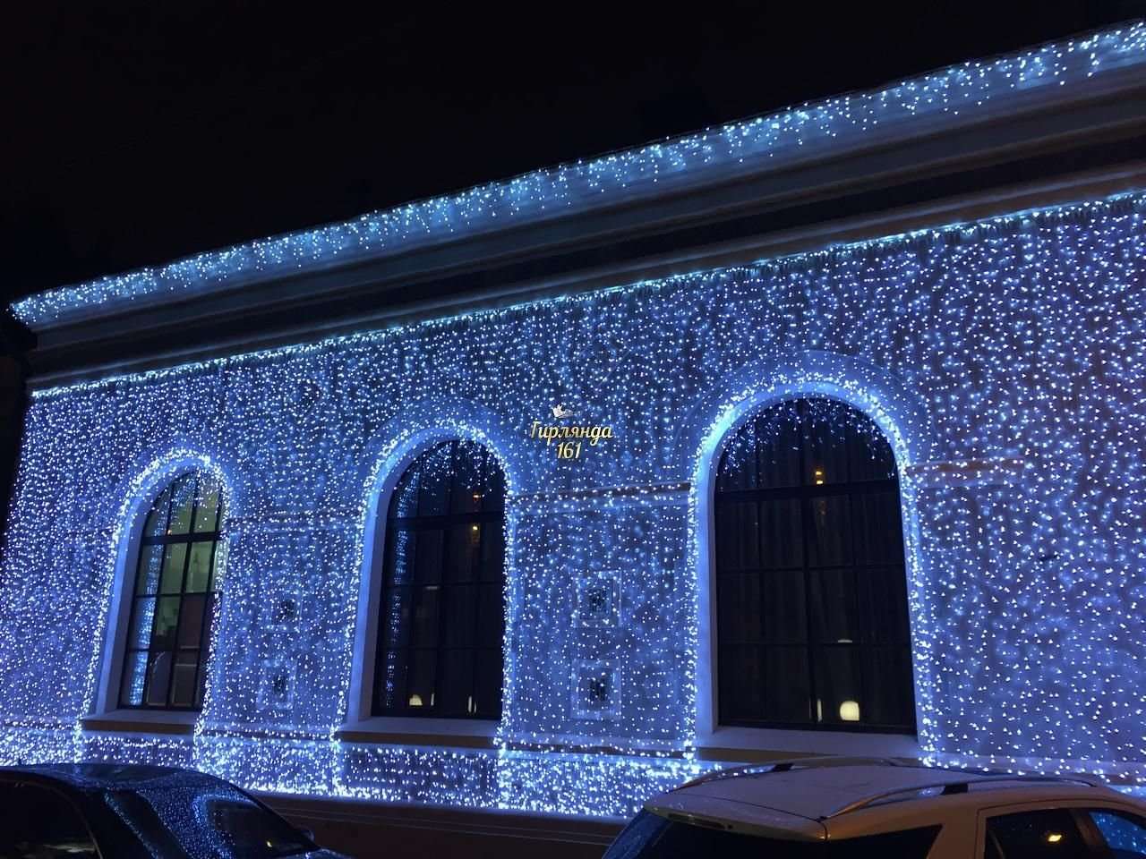 - Фасадную стену украшают длинные, трехметровые гирлянды. По периметру фасада светодиодная бахрома. Для оформления крыши также используются светодиодный занавес и бахрома. Нижняя грань фасада и контуры окон аккуратно подчеркнуты ровными линиями с помощью гибкого неона.