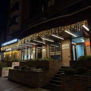 Фасадную часть здания украшает гирлянда тепло-белого цвета.