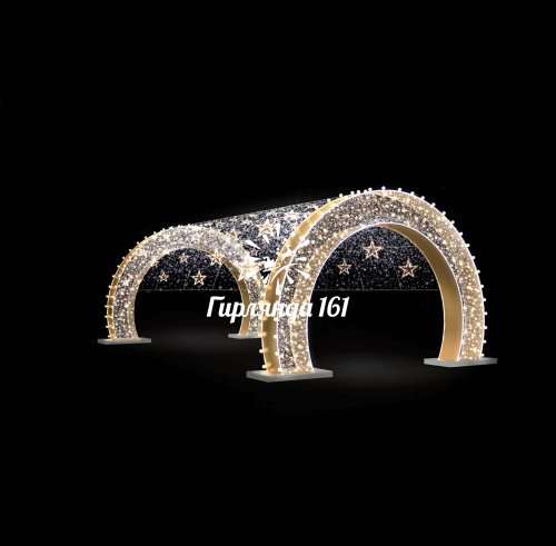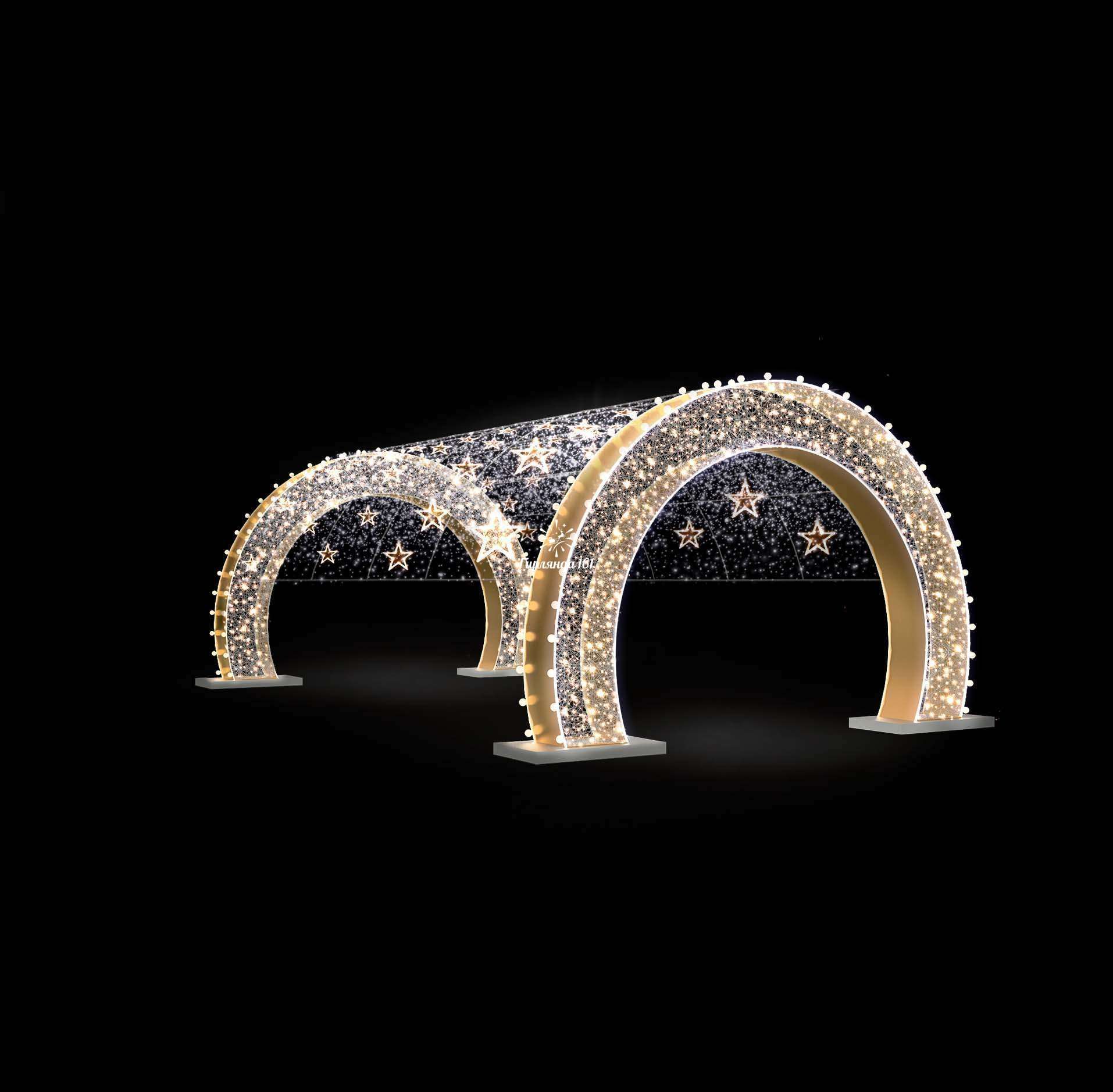 Световой тоннель "Звездный" - один из популярнейших вариантов в оформлении городских парков. Конструкция украшена светодиодными гирляндами нить, а светится она теплым-белым завораживающим светом. Такие тоннели создадут праздничное настроение и атмосферу торжества на городских улицах, бульварах, скверах, площадях, аллеях, а так же является великолепной фотозоной для жителей мегаполиса. Различные вариации размерного ряда и возможные световые решения позволяют подобрать идеальное оформление необходимой зоны.
