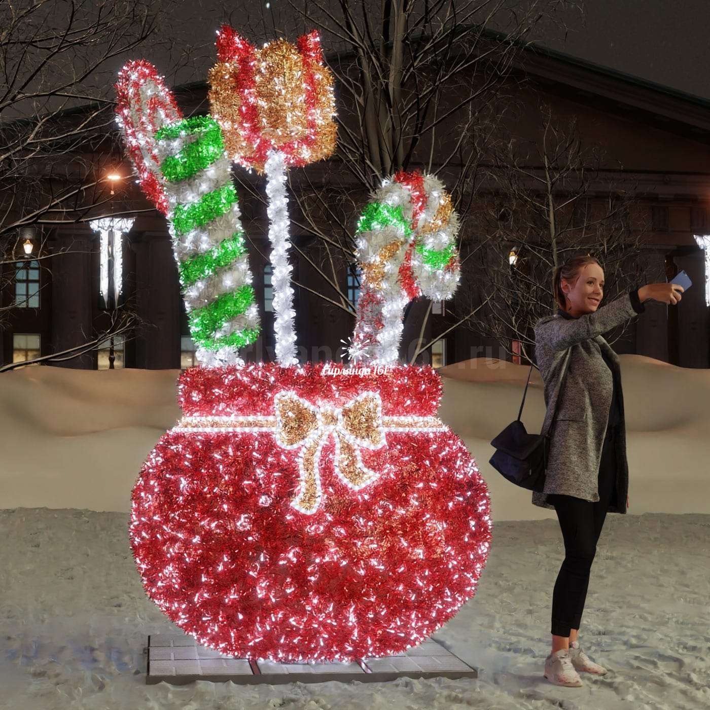 Световая фигура «Сказочный мешок из мишуры» — оригинальное новогоднее украшение для оформления городских пространств и торговых центров. Конструкция создает волшебную атмосферу праздника и становится отличным местом для фотосессий.