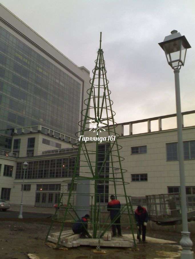 Уличные каркасные ели – лучший способ создания праздничной атмосферы. Каркасные новогодние ели могут устанавливаться в парках, скверах, возле торговых центров, в больших помещениях. Это сборно-разборная конструкция в виде конуса, к которой в определенной последовательности монтируются ветви. Поверхность ели может быть украшена оригинальными узорами, рисунками. При необходимости, вокруг дерева ставится ограждение в новогоднем стиле.