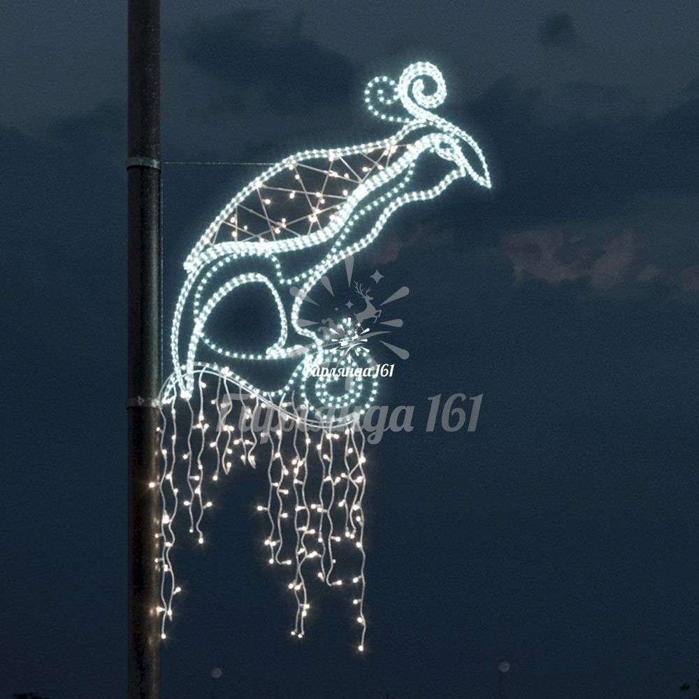 Декоративная светодиодная инсталляция в виде величественного сокола — эффектный элемент праздничного оформления городских пространств и общественных мест. Конструкция сочетает в себе традиционный образ птицы с современными технологиями освещения.Конструкция и материалы