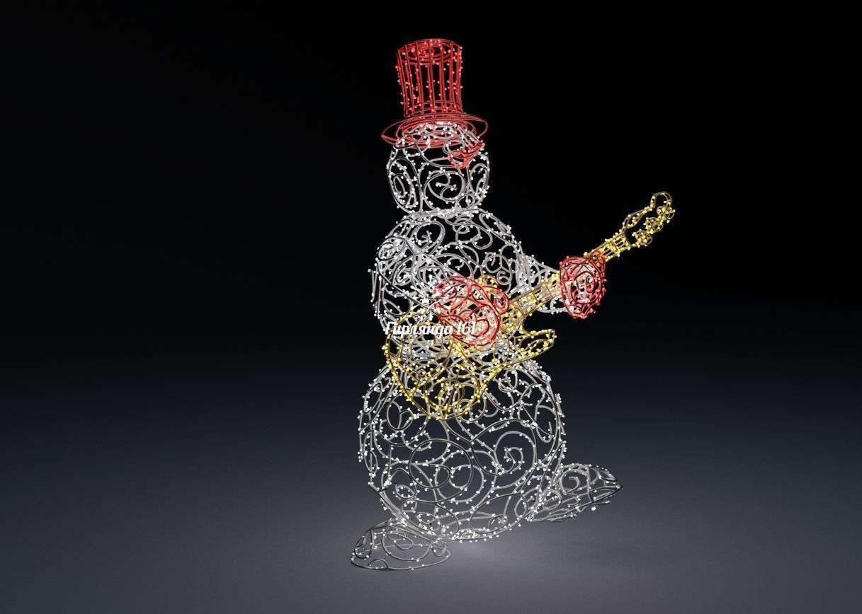 Стильный декоративный элемент — яркая световая фигура в виде крутого снеговика-гитариста, которая станет главным украшением праздничного пространства и задаст современное настроение всему новогоднему оформлению.