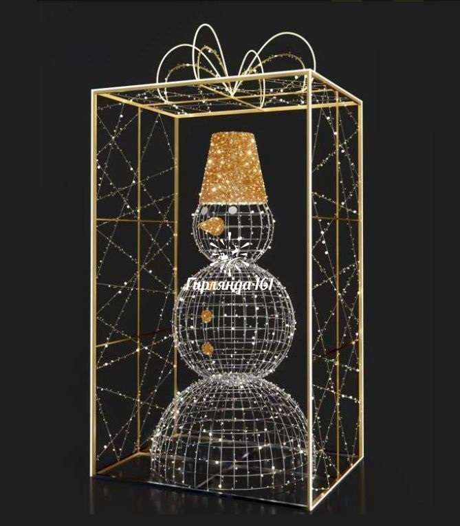 Праздничная декоративная фигура — впечатляющая световая композиция, изображающая очаровательного снеговика внутри праздничного подарка, которая станет главным украшением любого пространства в праздничный сезон.