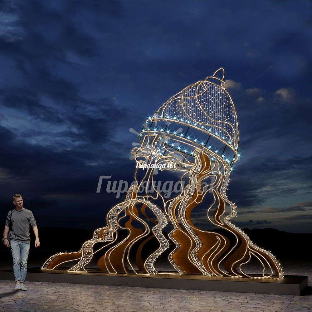 Сказочная световая композиция в образе величественного Дядьки Черномора — впечатляющий элемент праздничного оформления городских пространств и развлекательных площадок. Конструкция воплощает в себе сказочный образ с использованием современных технологий освещения.