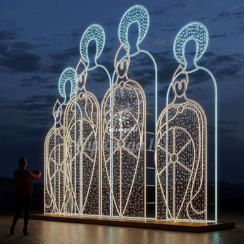 Представляем масштабную световую композицию «Витязи» — впечатляющий элемент декора для оформления городских пространств, парков и праздничных площадок. Конструкция воплощает в себе образы древнерусских воинов, создавая атмосферу былинного эпоса.Материалы и конструкция: