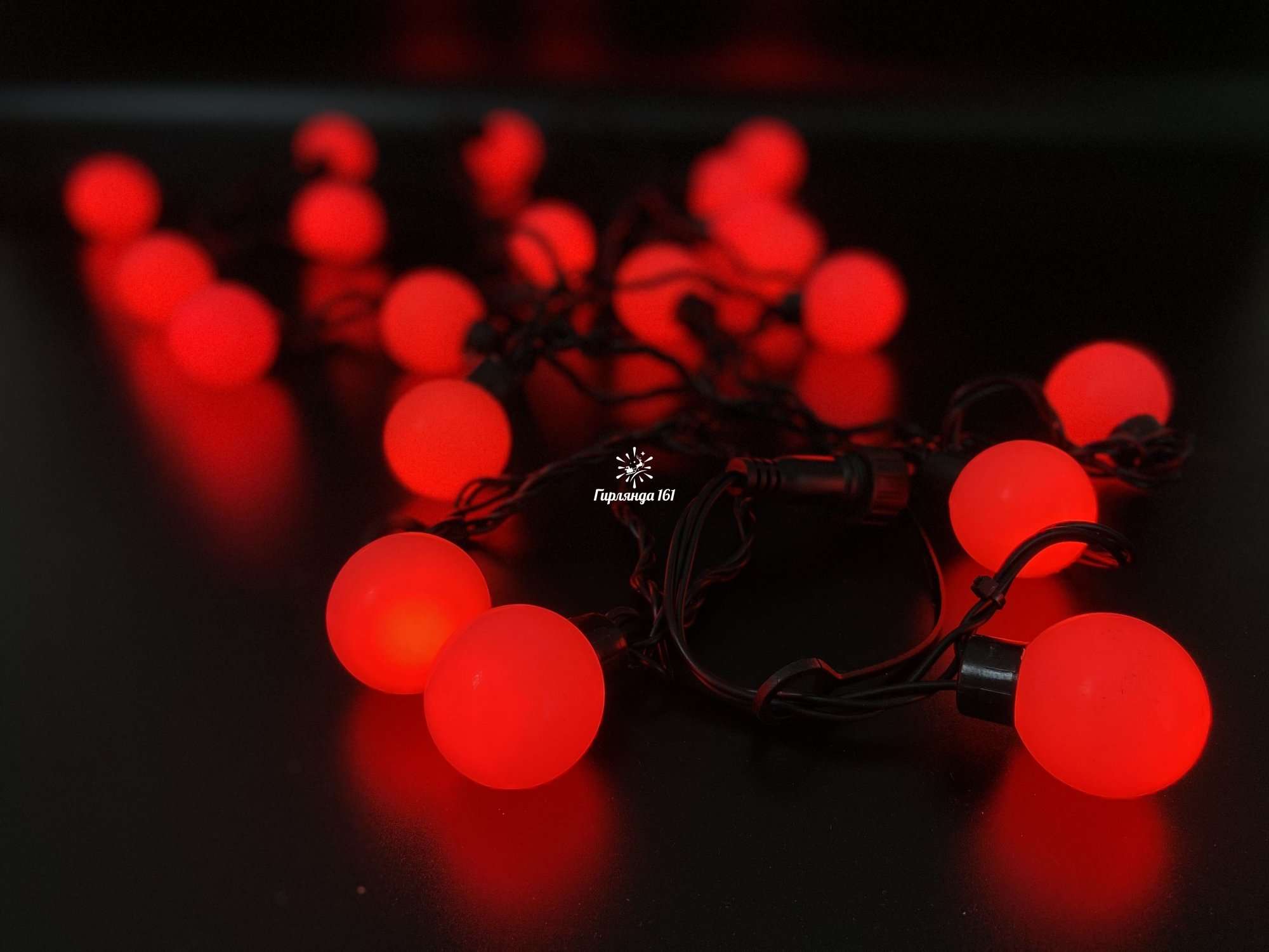 Гирлянда представляет собой профессиональное декоративное световое изделие с прозрачными пластиковыми шариками диаметром 40 мм, внутри которых размещены светодиоды красного свечения повышенной яркости. Идеально подходит для создания праздничной атмосферы и оформления различных объектов.