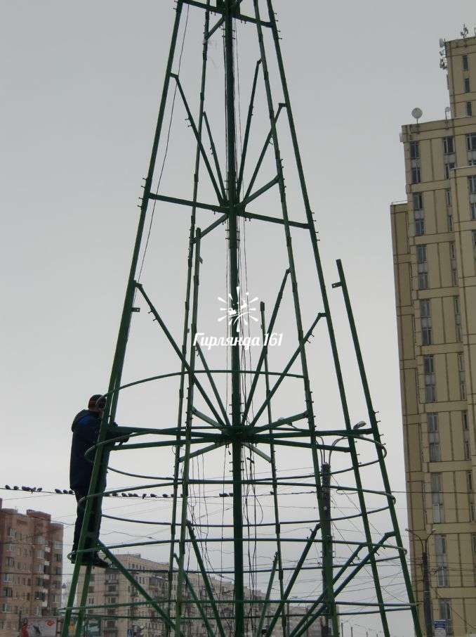 Уличные каркасные ели – лучший способ создания праздничной атмосферы. Каркасные новогодние ели могут устанавливаться в парках, скверах, возле торговых центров, в больших помещениях. Это сборно-разборная конструкция в виде конуса, к которой в определенной последовательности монтируются ветви. Поверхность ели может быть украшена оригинальными узорами, рисунками. При необходимости, вокруг дерева ставится ограждение в новогоднем стиле.