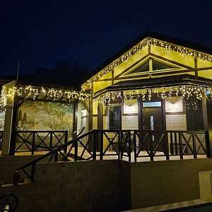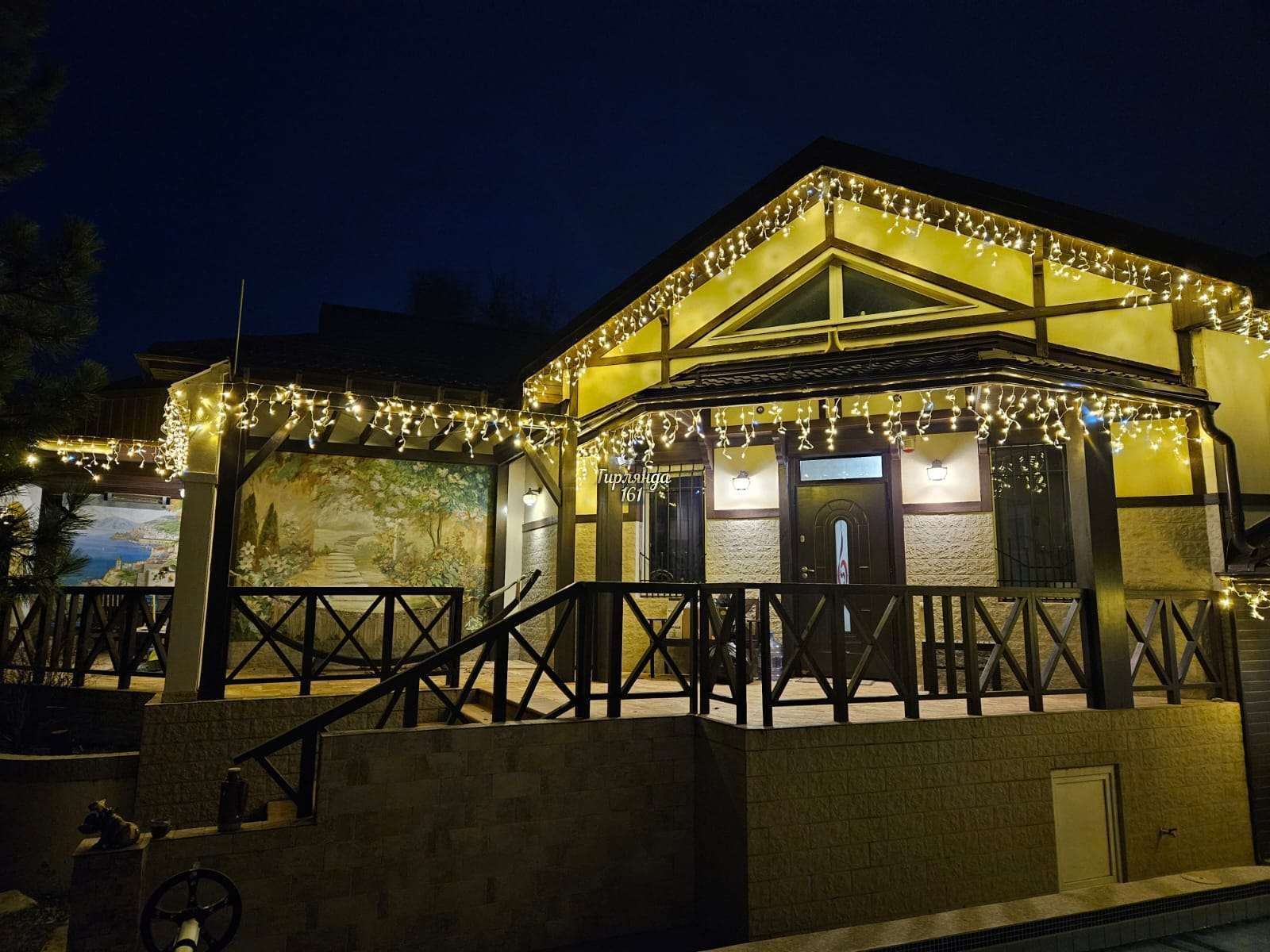 В проекте использовано сочетание декоративной подсветки бахромой по контуру .
